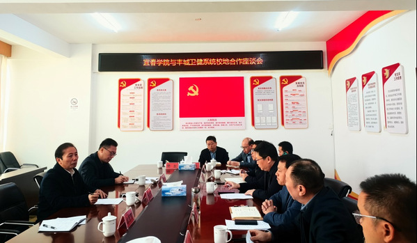 (本站讯)为推进区域卫生健康事业高质量发展,深化医教研协同创新,12月2日,校党委委员、副校长李建军,临床医学院院长陶正、副院长牟芳芳赴丰城市卫健委开展校地合作项目洽谈。洽谈会在丰城市卫健委会议室举行,市委常委聂勉,市卫健委党组书记甘琼华,副主任熊强,市人民医院党委书记熊良荣及分管同志李文波、谭细生、黄克文,市中医院党委书记喻映光及分管同志甘贱生,市妇幼保健院党支部书记付培天及分管同志樊红等出席交流会。甘琼华主持会议。
