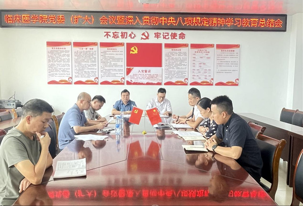 9月30日上午,临床医学院党委(扩大)会议暨深入贯彻中央八项规定精神学习教育总结会在学院第一会议室召开。会议坚持以习近平新时代中国特色社会主义思想为指导,传达学习习近平总书记关于深入贯彻中央八项规定精神学习教育的重要指示精神,贯彻落实中央、省委、市委及校党委相关会议精神,认真总结学院学习教育工作成效与经验,并就持续巩固拓展成果、推动作风建设常态化长效化进行布置。院党委书记吴永顺主持会议并讲话。院党委成员、各科室负责人、各党支部书记参加会议。