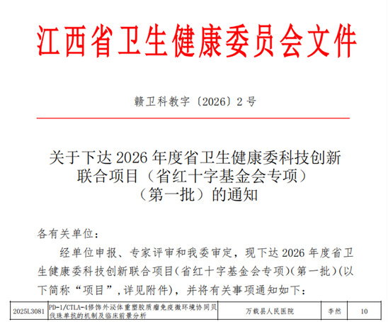 (本站讯)2月26日,江西省卫生健康委员会正式下达2026年度省卫生健康委科技创新联合项目(省红十字基金会专项)(第一批)立项通知。经单位申报、专家评审、现场答辩及省卫健委审定,由宜春学院临床医学院李然博士主持、以宜春学院第一附属医院(万载县人民医院)名义申报的《PD-1/CTLA-4修饰外泌体重塑胶质瘤免疫微环境协同贝伐珠单抗的机制及临床前景分析》(项目编号:2025L3081)成功获得立项。该项目总经费为20万元,为宜春市唯一入选项目,标志着宜春学院临床医学院与第一附属医院在科研合作领域取得重要突破。